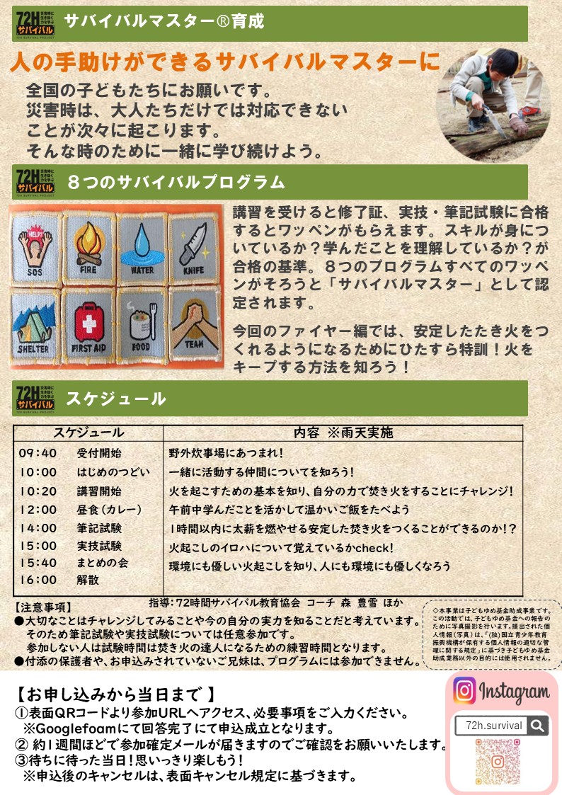 72時間サバイバル教育協会:体験学習を通じて、災害時に自助・共助出来るようになるための減災教育を行っております。